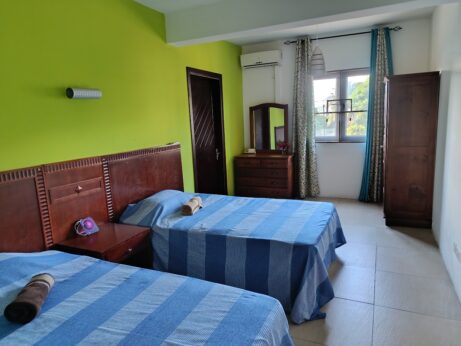 Nabízený byt je suchý, vzdušný, světlý a dostatečně prostorný - 160 m². Nachází se v prvním patře, je otočený do klidné ulice a má hezký výhled. Je vzdálený pouhých 150 metrů od pláže, 50 metrů od obchodu, stanoviště taxi a autobusové zastávky. Má tři prostorné ložnice, každá se svou vlastní koupelnou. Všechny tři ložnice jsou zamykatelné, mají klimatizaci, sítě proti komárům v oknech a ke každé posteli je k dispozici i moskytiéra. Nicméně po té, co jsme nainstalovali sítě do oken, už nejsou potřeba. V ložnici č.1 a č.2 jsou manželské postele, ložnice č. 3 má dvě samostatné postele. Do největší ložnice č.1 lze přidat přistýlku. Společné prostory zahrnují: kuchyňský kout, (vybavený filtry na vodu, pračkou, lednicí, plynovým sporákem, elektrickou troubou, mikrovlnkou, toustovačem, varnou konvicí, překapávačem na kávu, nádobím,...), jídelní kout s velkým stolem až pro osm osob a obývací část s televizí, plus dva balkony. První balkon je zařízený spíš technicky, tzn. že jsou zde sušáky na prádlo a úklidové pomůcky, nicméně i zde je odpočinkový koutek. Druhý balkon, určený k relaxaci a stolování na čerstvém vzduchu, je stíněný palmami, tudíž je i více chráněný před sluncem, větrem i případným deštěm.