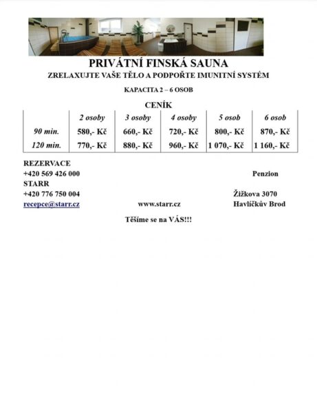 Máte jedinečnou příležitost zpříjemnit  si víkend například masáží či pobytem v sauně. Jen se musíte předem a včas objednat. Taktéž ubytování si zajistěte sami. Máte tu ceníky i kontakty.